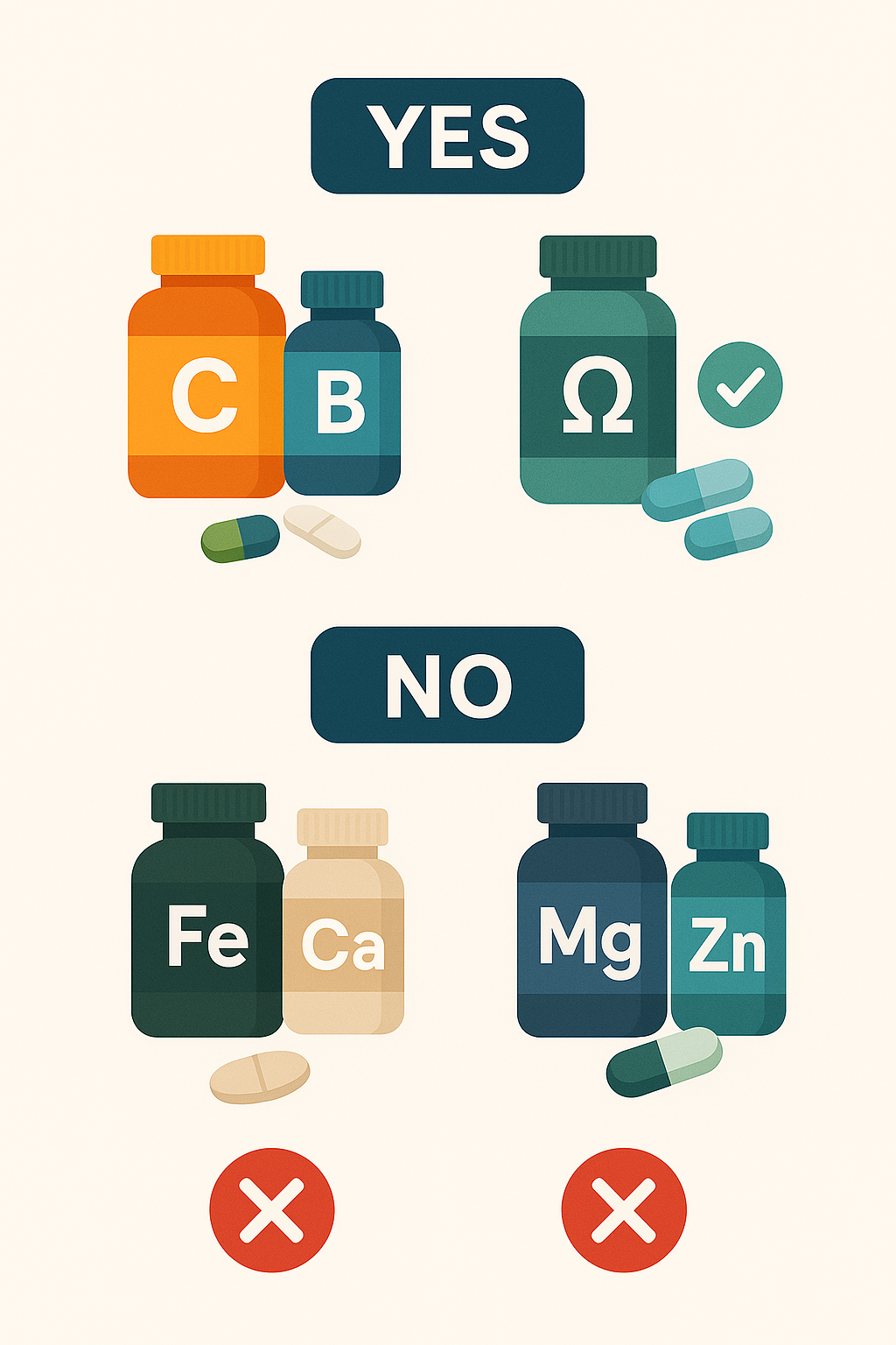 조합함께 먹어도 되는가?팁철분 + 칼슘❌ No시간대 나누기비타민 B + C✅ Yes아침에 함께오메가3 + 비타민 E✅ Yes식사 후마그네슘 + 아연❌ No최소 2시간 간격칼슘 + 마그네슘✅ Yes비율 2:1 유지